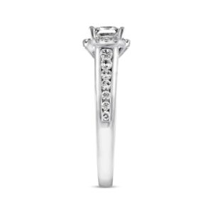 The center of this pretty engagement ring features a princess-cut diamond center resting in a glimmering frame of round diamonds. Additional round diamonds are in the 14K white gold band, bringing the total weight of the ring to 5/8 carat. From the Now & Forever? Bridal Collection.